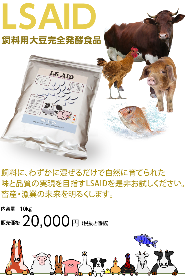 LSAID(エルエスエイド)には、タンパク質分解菌群、セルロース分解菌群、油脂分解菌群、デンプン分解菌群の4種類の有用細菌群と乳酸菌が含まれており、これが家畜の腸内に直接働きかけます。また、発酵過程で得られる有用なアミノ酸がたくさん含まれています。安全性においても、含まれる菌類の検査を複数の公的機関、民間機関に委託しており安全性が検証された物だけを出荷しています。もとより、天然有機な成分で構成されており、化学薬品由来の添加物等を一切含みません。原材料: 豆腐カス栄養成分(100g あたり)エネルギー377kcal ・タンパク質19.5g ・脂質8.5g ・炭水化物55.5g ・水分12.7g ・灰分3.8g ・PH5.3使用量(日量/1個体)鶏: 0.1g〜0.3g豚: 1g〜2.5g牛: 2g〜3g魚: 飼料に対して0.2%検査を受けている機関は以下の通りです。(1)一般社団法人 高知県食品衛生協会(製造の都度食品衛生検査を依頼)(2)一般社団法人 農民連食品分析センター(残留農薬の検査を依頼)(3)株式会社 日本食品機能分析研究所(定期的な成分分析を依頼)(4)株式会社 食品微生物センター(発酵用菌体の菌群検査を依頼)いずれの機関による検査においても、すべて補助飼料として販売できることを確認、証明されております。